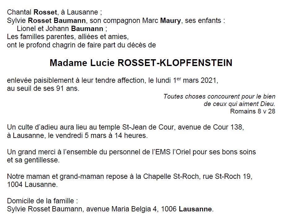 Madame Lucie ROSSET-KLOPFENSTEIN 04 mai. 1930 - 01 mar. 2021 Avis mortuaire PFG Télecharger PDF Partager sur: Galerie PreviousNext PreviousNext