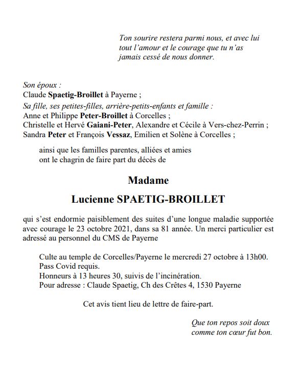 Madame Lucienne SPAETIG-BROILLET 21 jan. 1941 - 23 oct. 2021 Avis mortuaire PFG Télecharger PDF Partager sur: Galerie PreviousNext PreviousNext