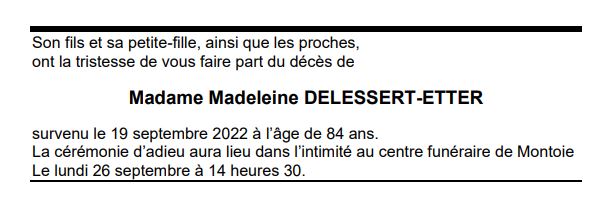Madame Madeleine DELESSERT-ETTER 05 juil. 1938 - 19 sep. 2022 Avis mortuaire PFG Télecharger PDF Partager sur: Galerie PreviousNext PreviousNext