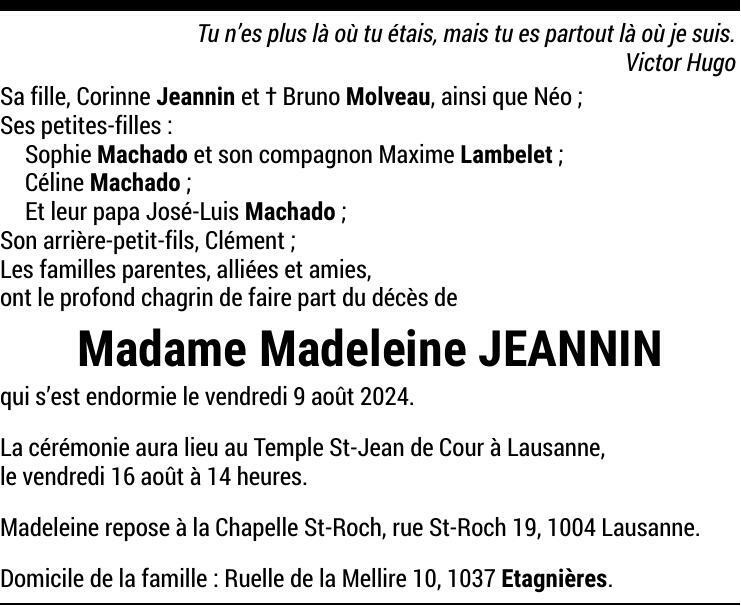 Madame Madeleine JEANNIN 05 déc. 1937 - 09 aoû. 2024 Avis mortuaire PFG Partager sur: Galerie PreviousNext PreviousNext