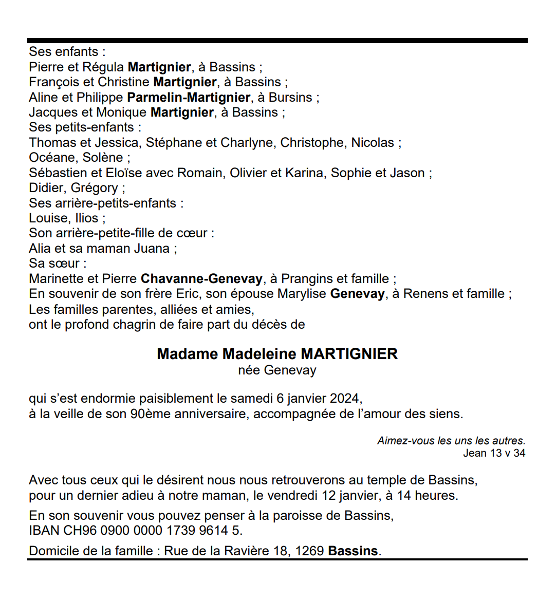 Madame Madeleine MARTIGNIER née Genevay 09 jan. 1934 - 06 jan. 2024 Avis mortuaire PFG Télecharger PDF Partager sur: Galerie PreviousNext PreviousNext