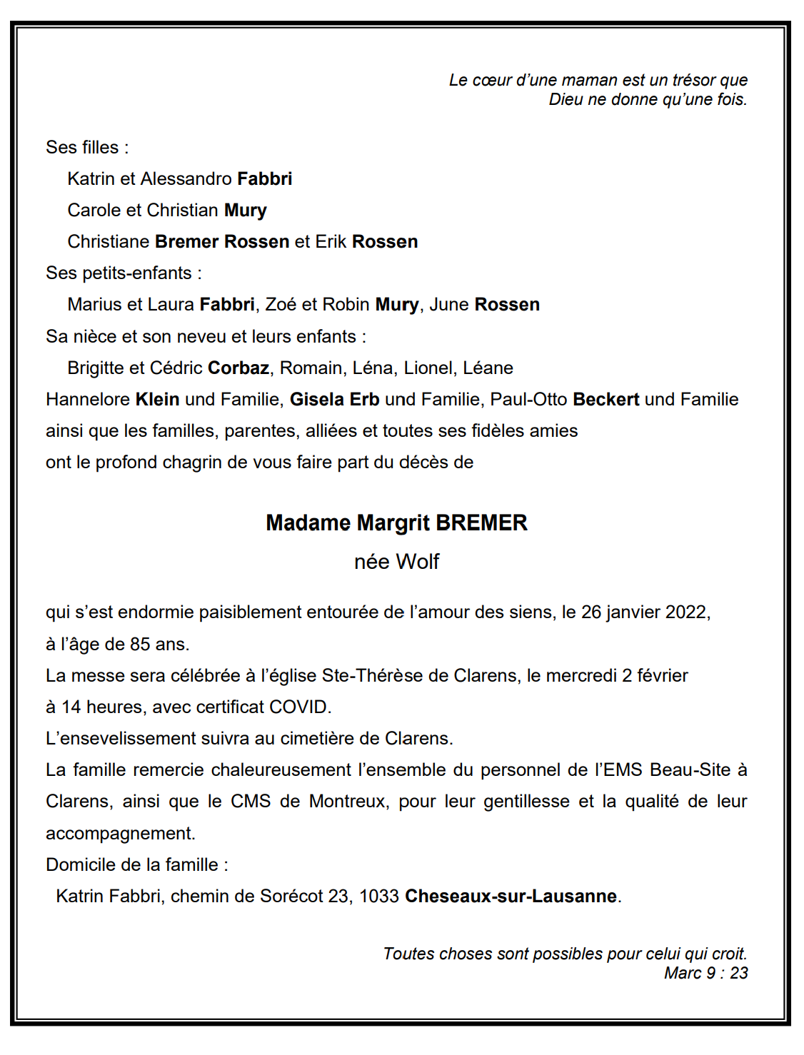 Madame Margrit BREMER 08 jan. 1937 - 26 jan. 2022 Avis mortuaire PFG Télecharger PDF Partager sur: Galerie PreviousNext PreviousNext