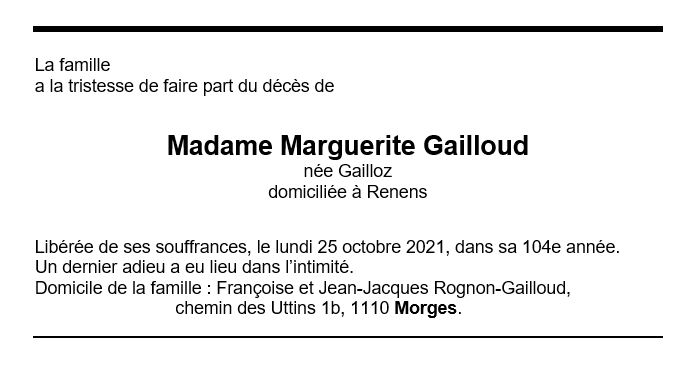Madame Marguerite Gailloud 12 oct. 1918 - 25 oct. 2021 Avis mortuaire PFG Télecharger PDF Partager sur: Galerie PreviousNext PreviousNext
