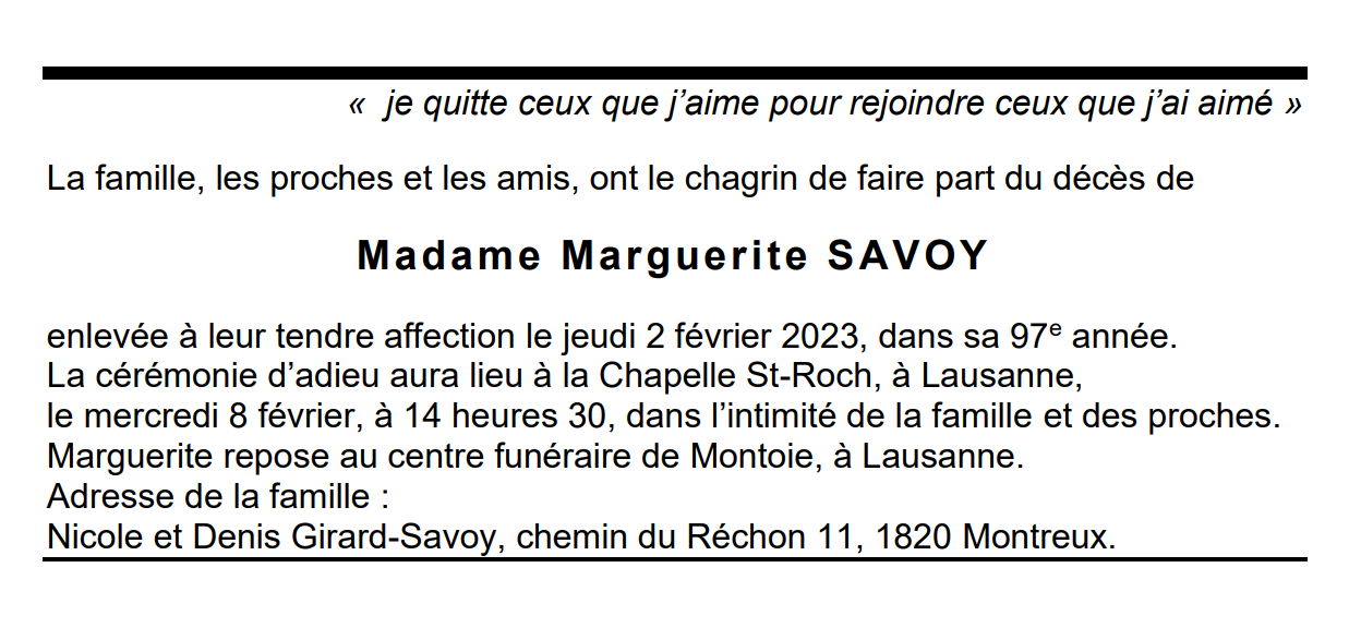 Madame Marguerite SAVOY 23 juin. 1926 - 02 fév. 2023 Avis mortuaire PFG Télecharger PDF Partager sur: Galerie PreviousNext PreviousNext