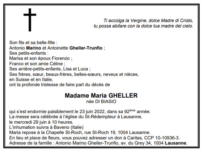 Madame Maria GHELLER 21 juil. 1930 - 23 juin. 2022 Avis mortuaire PFG Télecharger PDF Partager sur: Galerie PreviousNext PreviousNext