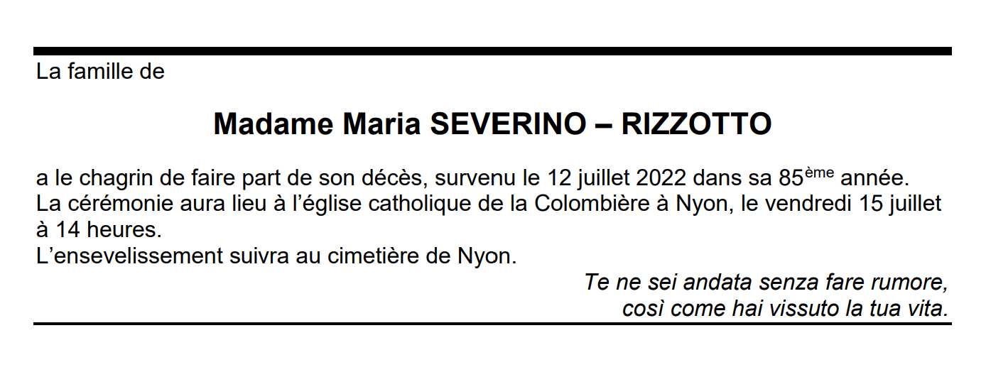Madame Maria SEVERINO – RIZZOTTO 27 juil. 1937 - 12 juil. 2022 Avis mortuaire PFG Télecharger PDF Partager sur: Galerie PreviousNext PreviousNext