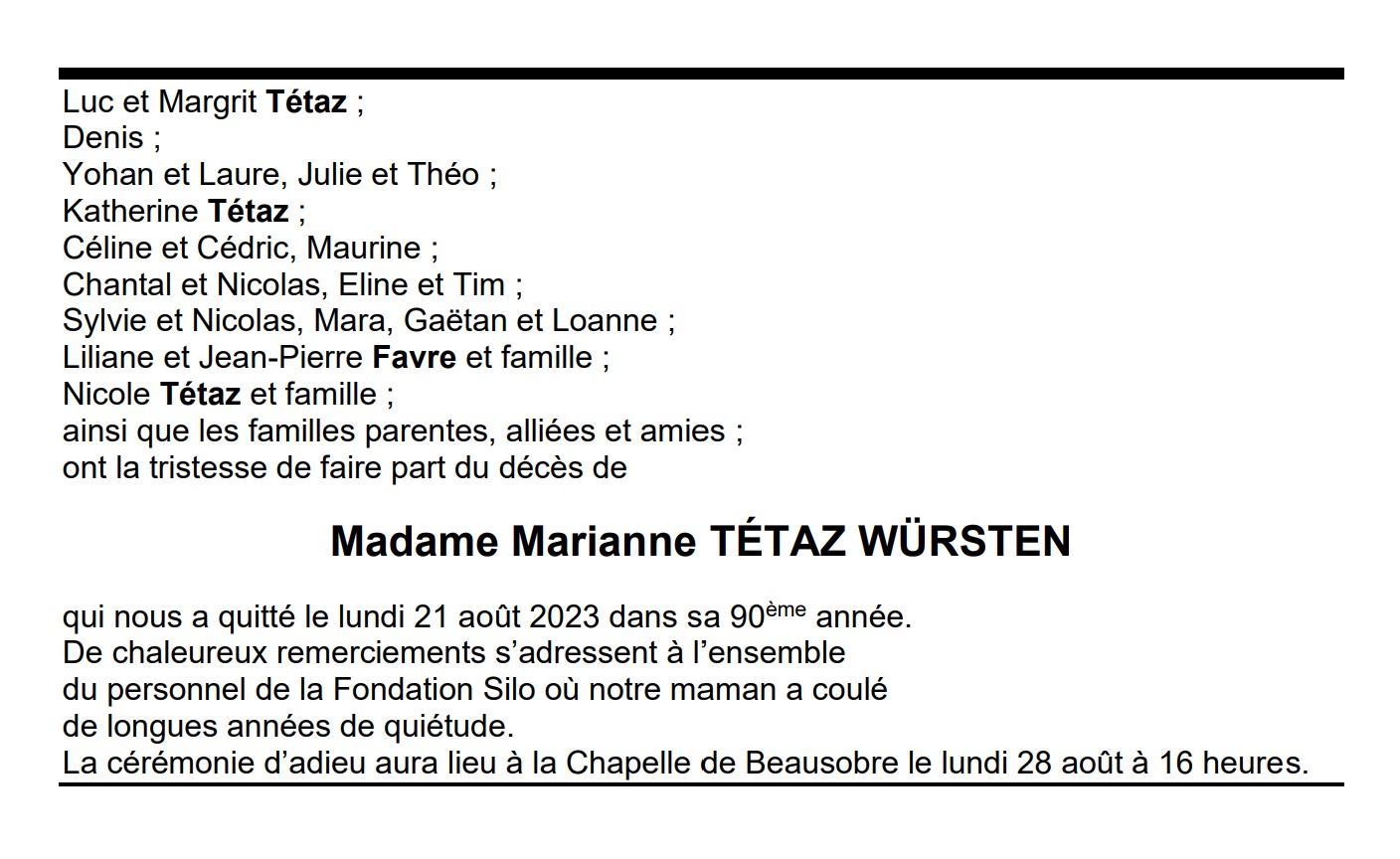 Madame Marianne TÉTAZ WÜRSTEN 24 nov. 1933 - 21 aoû. 2023 Avis mortuaire PFG Télecharger PDF Partager sur: Galerie PreviousNext PreviousNext