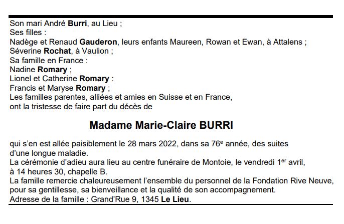 Madame Marie-Claire BURRI 12 oct. 1946 - 28 mar. 2022 Avis mortuaire PFG Télecharger PDF Partager sur: Galerie PreviousNext PreviousNext