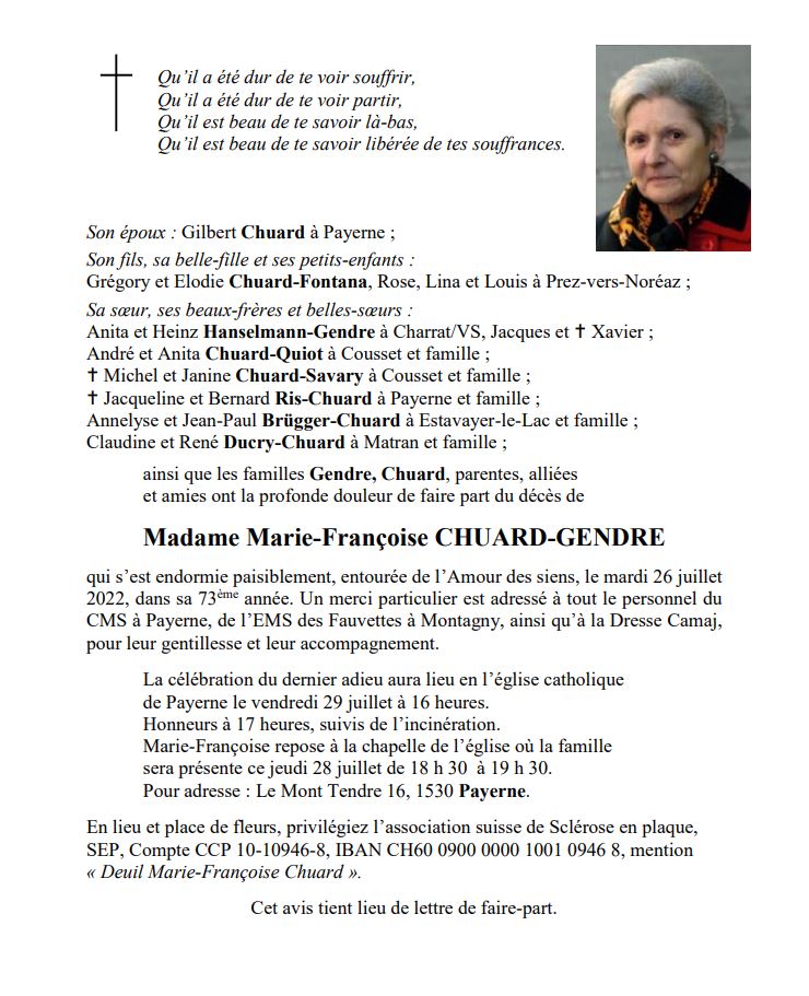 Madame Marie-Françoise CHUARD-GENDRE 05 nov. 1949 - 26 juil. 2022 Avis mortuaire PFG Télecharger PDF Partager sur: Galerie PreviousNext PreviousNext