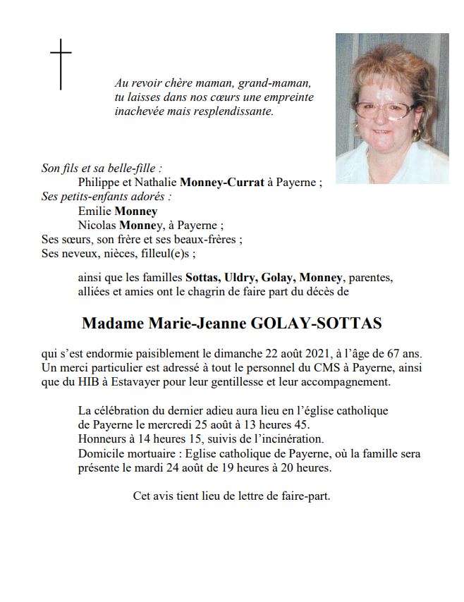 Madame Marie-Jeanne GOLAY-SOTTAS 16 mar. 1954 - 22 aoû. 2021 Avis mortuaire PFG Télecharger PDF Partager sur: Galerie PreviousNext PreviousNext