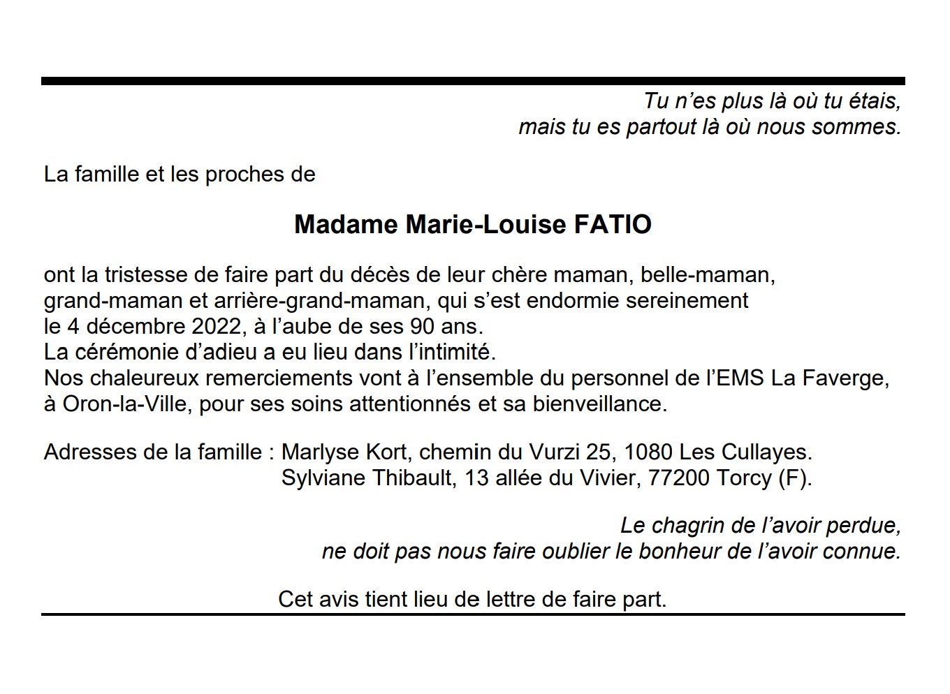 Madame Marie-Louise FATIO 26 jan. 1933 - 04 déc. 2022 Avis mortuaire PFG Télecharger PDF Partager sur: Galerie PreviousNext PreviousNext