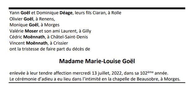 Madame Marie-Louise Goël 21 nov. 1920 - 13 juil. 2022 Avis mortuaire PFG Télecharger PDF Partager sur: Galerie PreviousNext PreviousNext