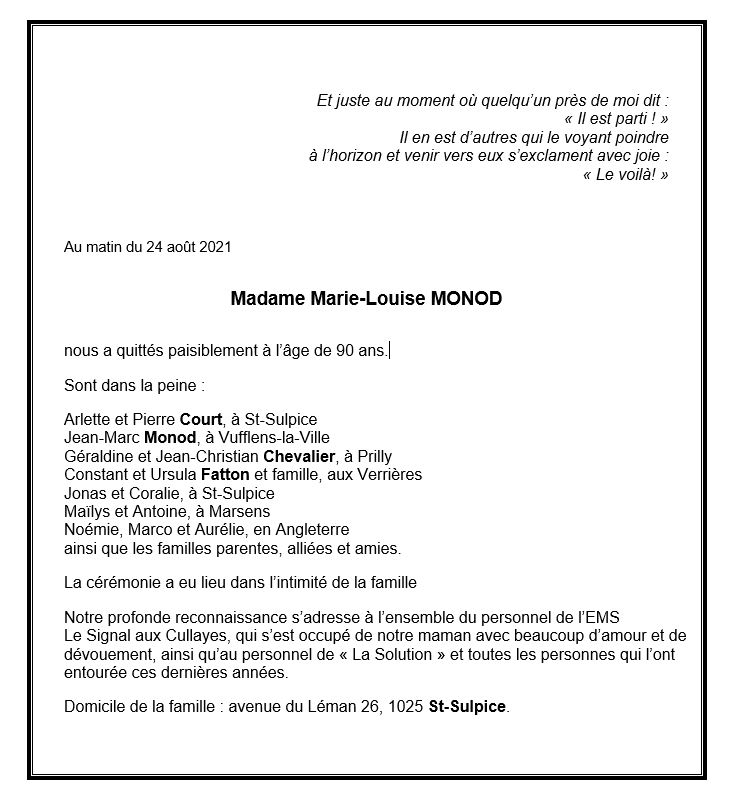 Madame Marie-Louise MONOD 18 juil. 1931 - 24 aoû. 2021 Avis mortuaire PFG Télecharger PDF Partager sur: Galerie