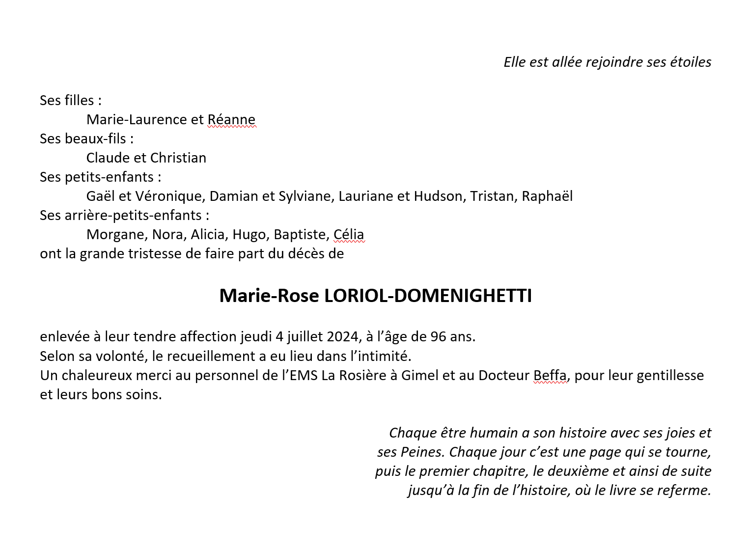 Madame Marie-Rose LORIOL 02 fév. 1930 - 20 juin. 2024 Avis mortuaire PFG Télecharger PDF Partager sur: Galerie