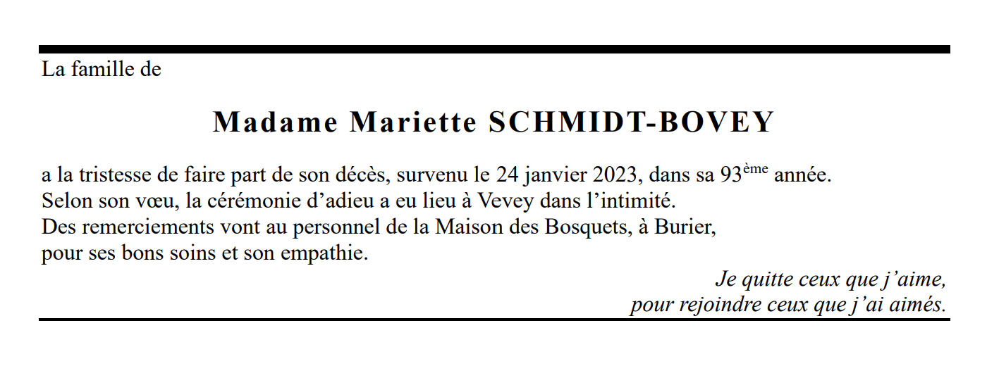 Madame Mariette SCHMIDT-BOVEY 01 aoû. 1930 - 24 jan. 2023 Avis mortuaire PFG Télecharger PDF Partager sur: Galerie PreviousNext PreviousNext