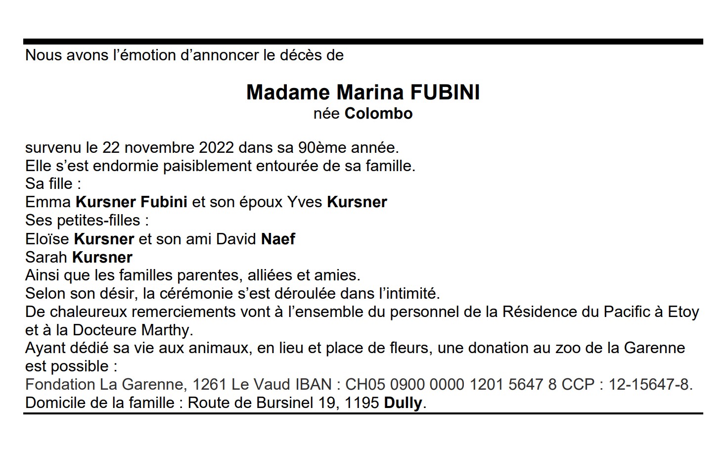 Madame Marina FUBINI 23 mai. 1933 - 22 nov. 2022 Avis mortuaire PFG Télecharger PDF Partager sur: Galerie PreviousNext PreviousNext