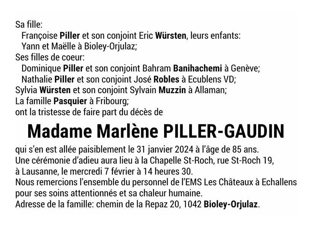 Madame Marlène PILLER-GAUDIN 05 oct. 1938 - 31 jan. 2024 Avis mortuaire PFG Télecharger PDF Partager sur: Galerie PreviousNext PreviousNext
