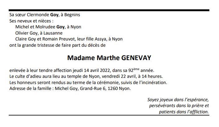 Madame Marthe GENEVAY 02 juil. 1930 - 14 avr. 2022 Avis mortuaire PFG Télecharger PDF Partager sur: Galerie PreviousNext PreviousNext