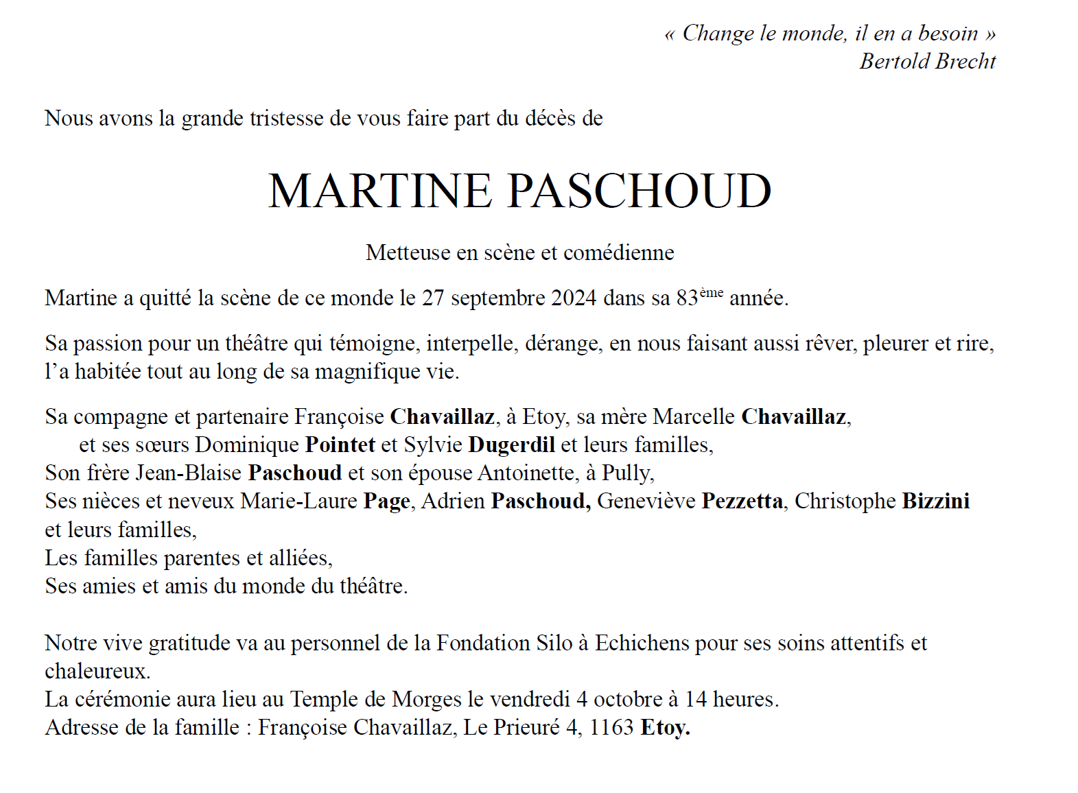 Madame Martine PASCHOUD 06 avr. 1942 - 27 sep. 2024 Avis mortuaire PFG Télecharger PDF Partager sur: Galerie PreviousNext PreviousNext