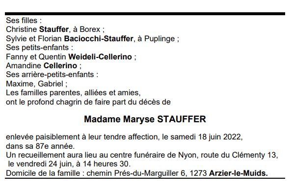 Madame Maryse STAUFFER 25 sep. 1935 - 18 juin. 2022 Avis mortuaire PFG Télecharger PDF Partager sur: Galerie PreviousNext PreviousNext