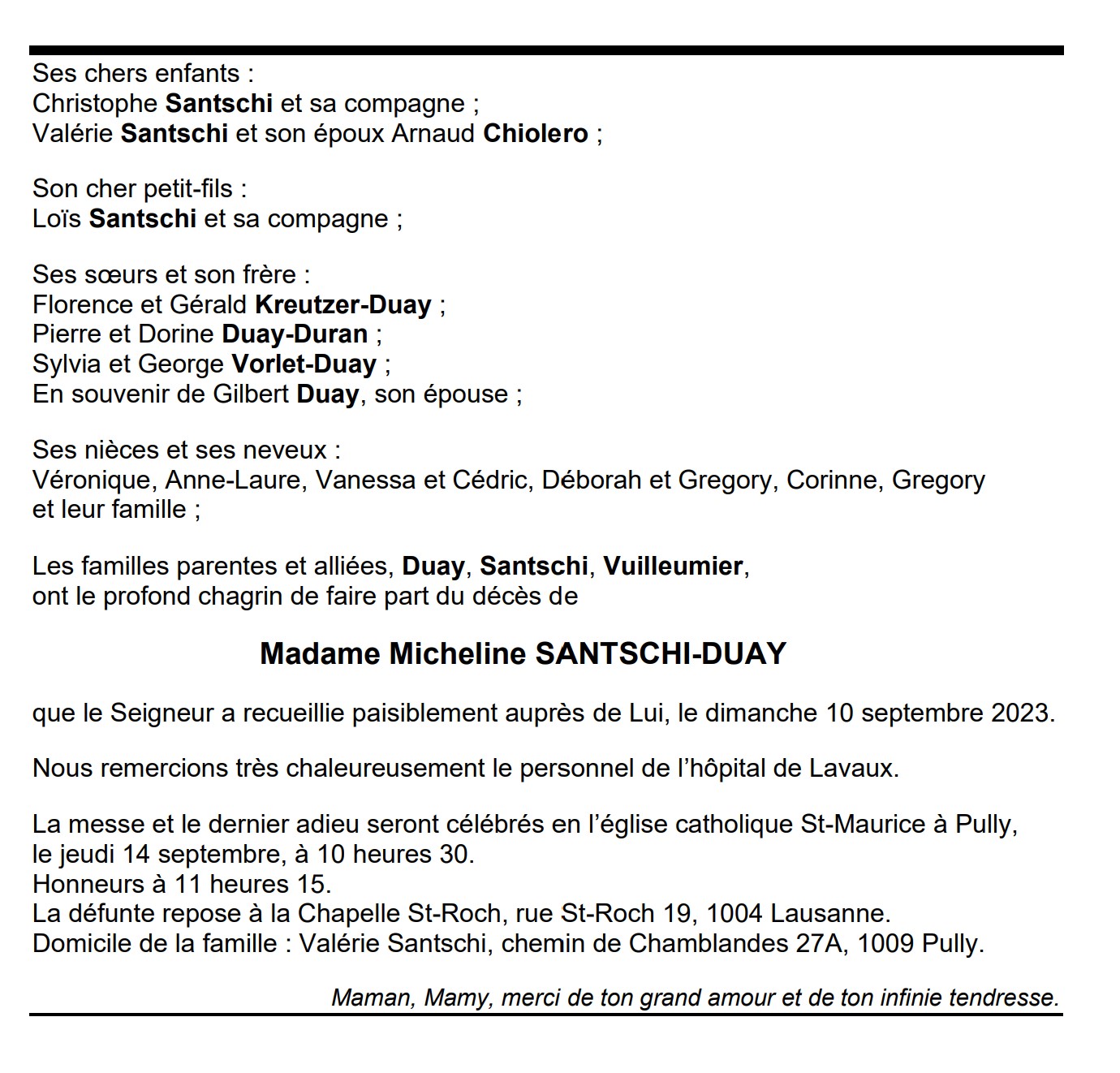 Madame Micheline SANTSCHI-DUAY 21 juil. 1940 - 10 sep. 2023 Avis mortuaire PFG Télecharger PDF Partager sur: Galerie PreviousNext PreviousNext