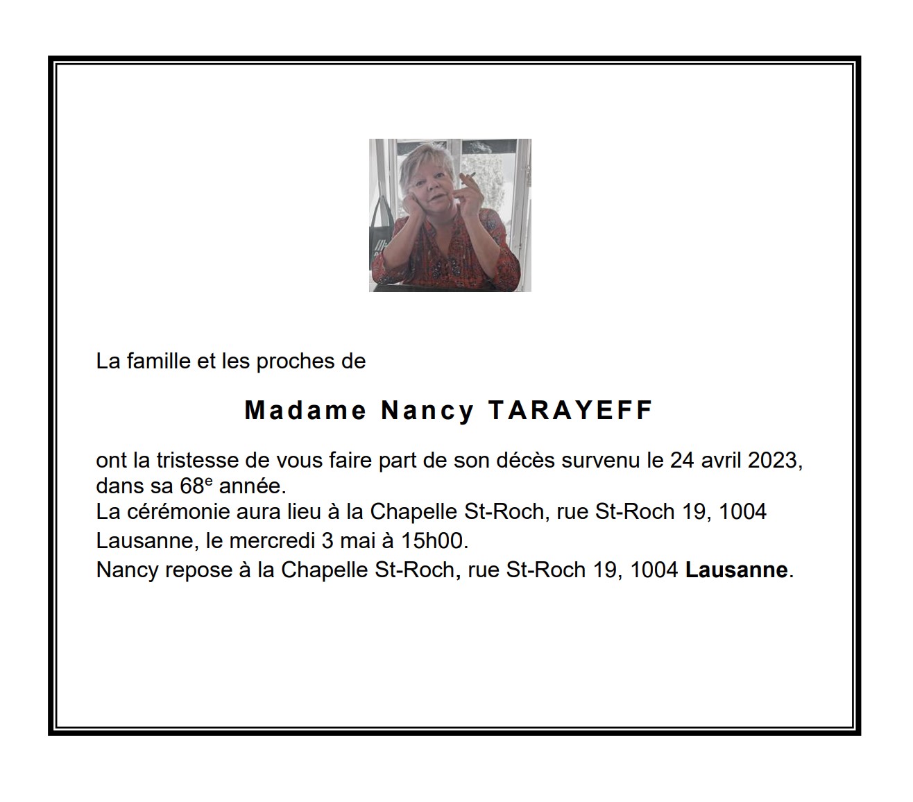 Madame Nancy TARAYEFF 05 oct. 1955 - 24 avr. 2023 Avis mortuaire PFG Télecharger PDF Partager sur: Galerie PreviousNext PreviousNext