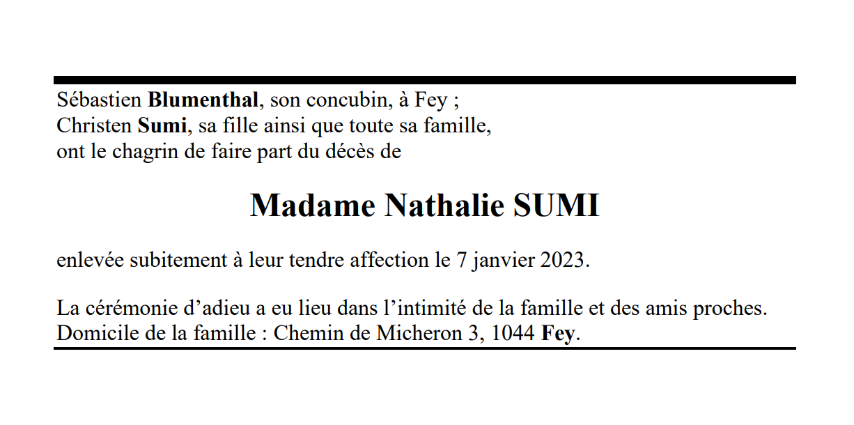 Madame Nathalie SUMI 05 mai. 1971 - 07 jan. 2023 Avis mortuaire PFG Télecharger PDF Partager sur: Galerie PreviousNext PreviousNext