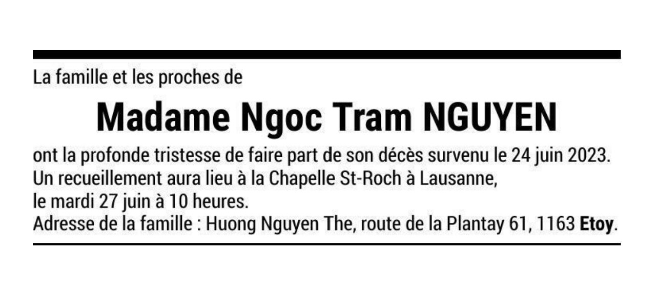 Madame Ngo Tram NGUYEN 24 juin. 2023 Avis mortuaire PFG Télecharger PDF Partager sur: Galerie PreviousNext PreviousNext