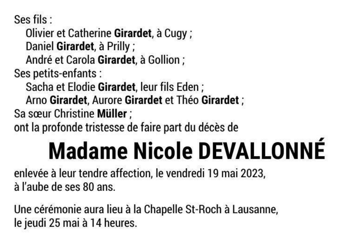 Madame Nicole DEVALLONNÉ 04 juin. 1943 - 19 mai. 2023 Avis mortuaire PFG Télecharger PDF Partager sur: Galerie PreviousNext PreviousNext