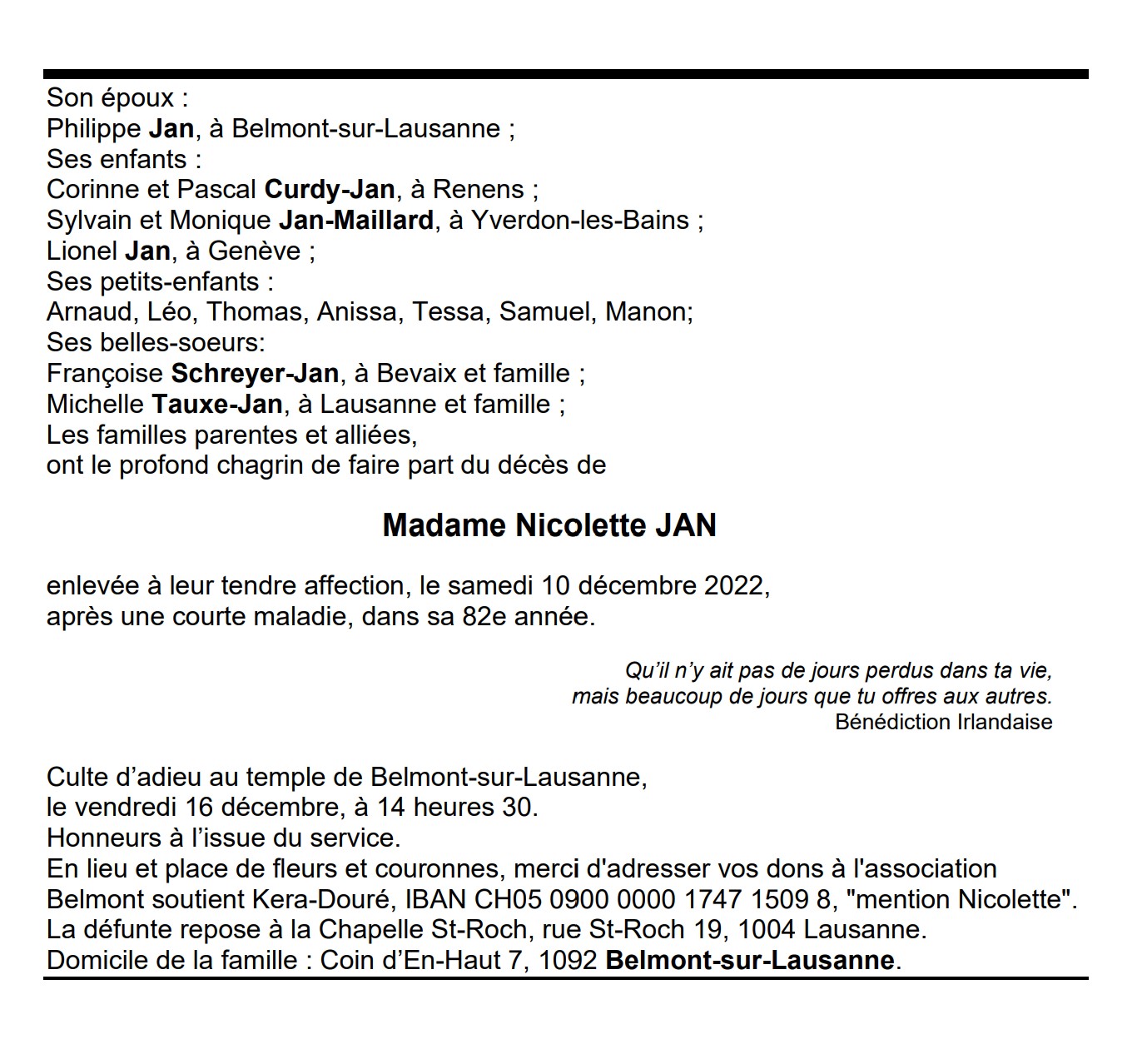 Madame Nicolette JAN 17 jan. 1941 - 10 déc. 2022 Avis mortuaire PFG Télecharger PDF Partager sur: Galerie PreviousNext PreviousNext