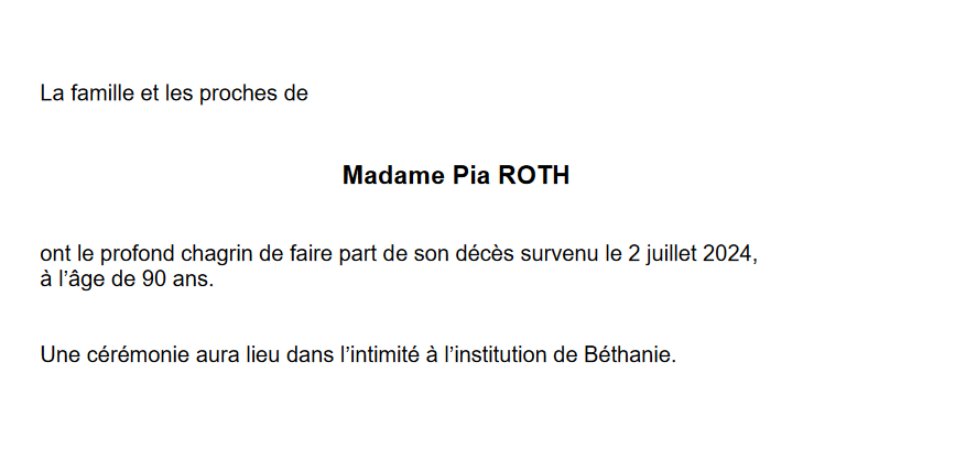 Madame Pia ROTH 06 nov. 1933 - 02 juil. 2024 Avis mortuaire PFG Télecharger PDF Partager sur: Galerie
