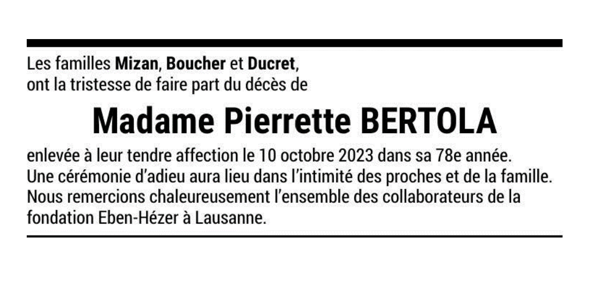Madame Pierrette BERTOLA 30 nov. 1945 - 10 oct. 2023 Avis mortuaire PFG Télecharger PDF Partager sur: Galerie PreviousNext PreviousNext