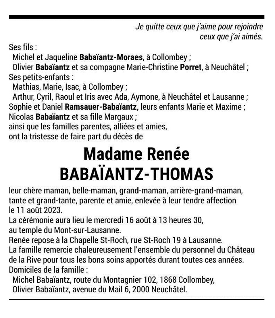 Madame Renée BABAÏANTZ-THOMAS 18 sep. 1935 - 11 aoû. 2023 Avis mortuaire PFG Télecharger PDF Partager sur: Galerie PreviousNext PreviousNext