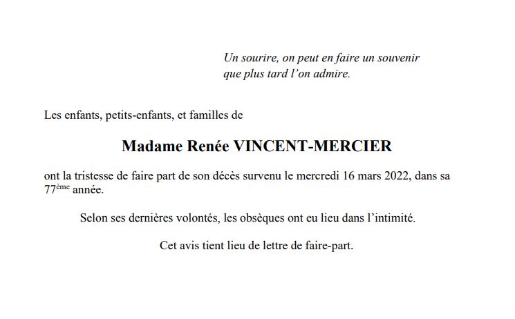 Madame Renée VINCENT-MERCIER 05 juin. 1945 - 16 mar. 2022 Avis mortuaire PFG Télecharger PDF Partager sur: Galerie