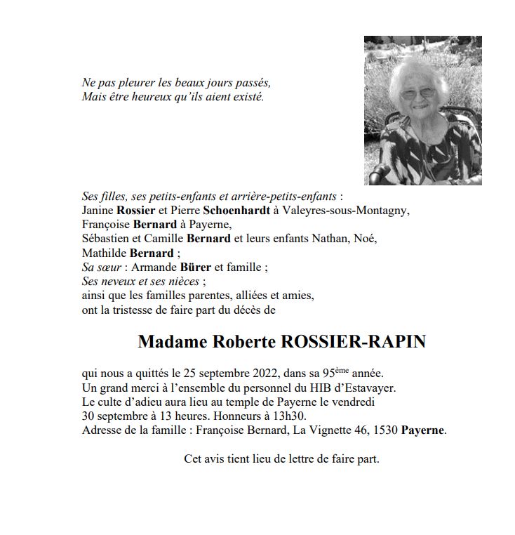 Madame Roberte ROSSIER-RAPIN 08 déc. 1927 - 25 sep. 2022 Avis mortuaire PFG Télecharger PDF Partager sur: Galerie PreviousNext PreviousNext