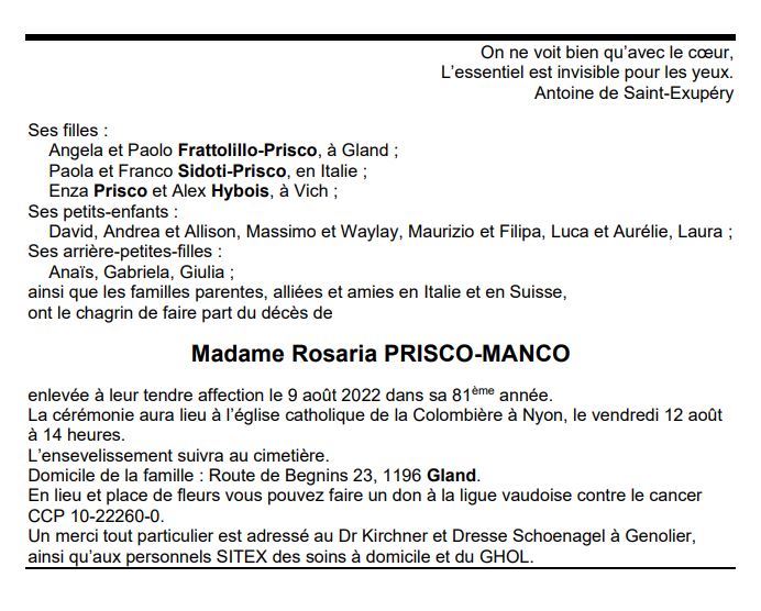 Madame Rosaria PRISCO-MANCO 10 nov. 1941 - 09 aoû. 2022 Avis mortuaire PFG Télecharger PDF Partager sur: Galerie PreviousNext PreviousNext