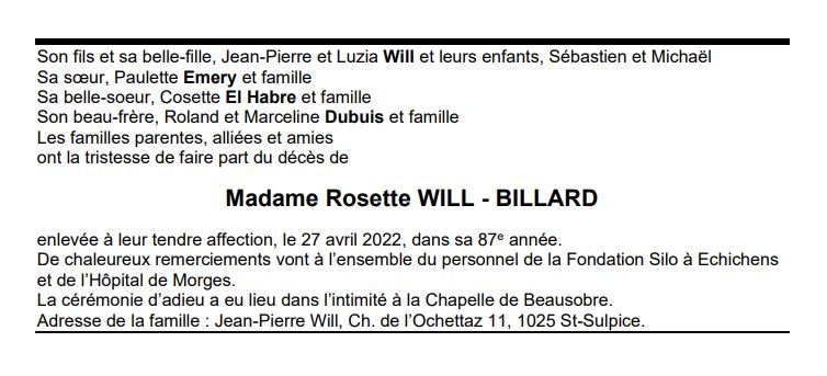 Madame Rosette WILL - BILLARD 05 fév. 1936 - 27 avr. 2022 Avis mortuaire PFG Télecharger PDF Partager sur: Galerie PreviousNext PreviousNext