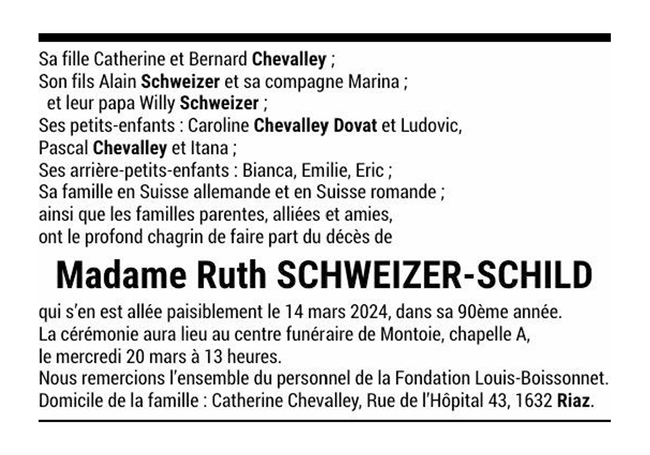 Madame Ruth SCHWEIZER-SCHILD 08 aoû. 1934 - 14 mar. 2024 Avis mortuaire PFG Télecharger PDF Partager sur: Galerie PreviousNext PreviousNext
