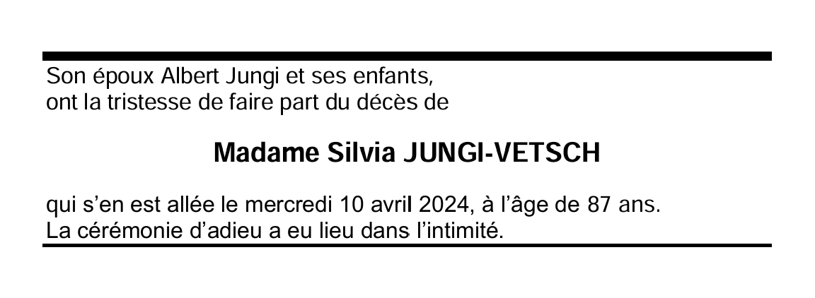 Madame Silvia JUNGI-VETSCH 15 fév. 1937 - 10 avr. 2024 Avis mortuaire PFG Télecharger PDF Partager sur: Galerie PreviousNext PreviousNext