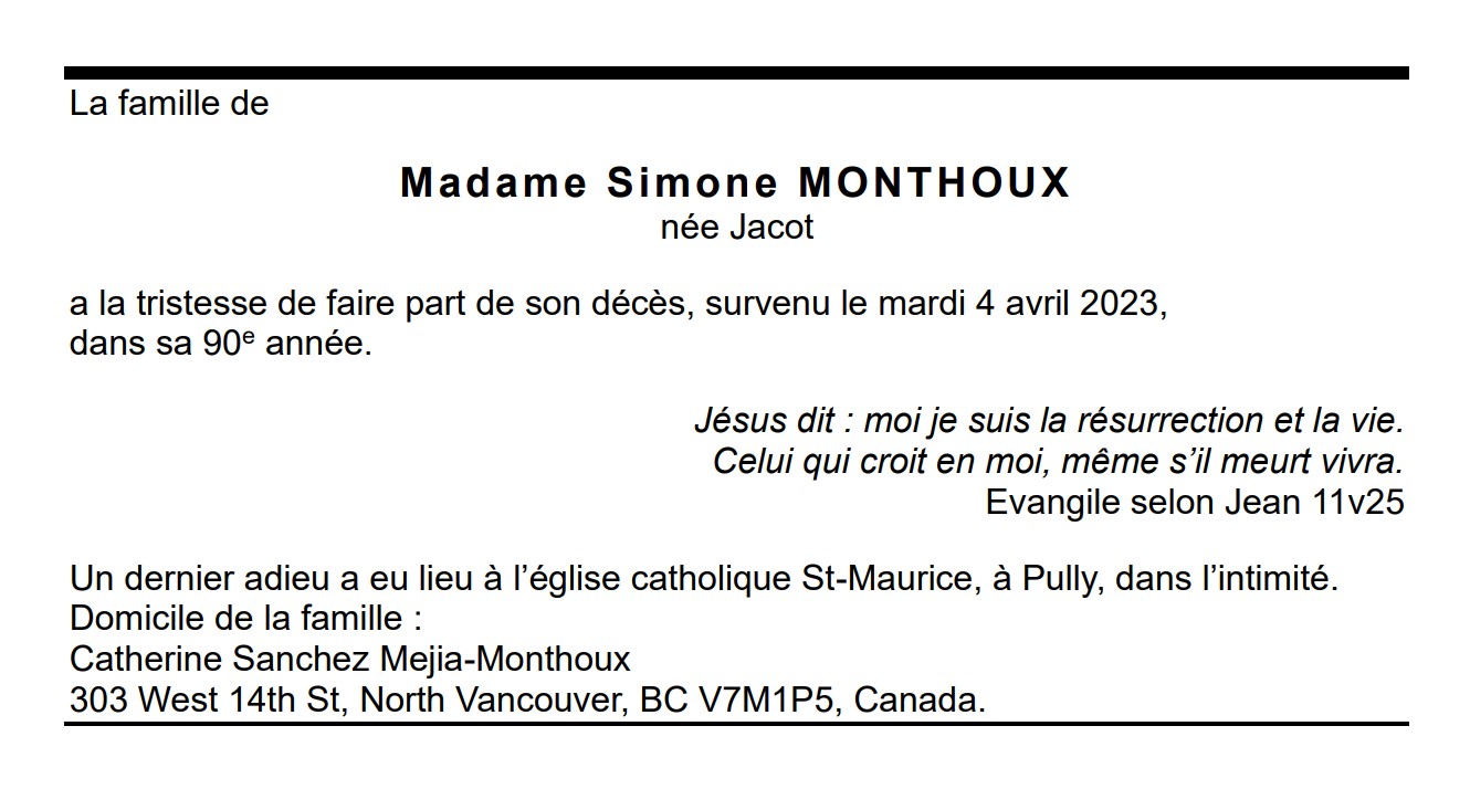 Madame Simone MONTHOUX 12 aoû. 1933 - 04 avr. 2023 Avis mortuaire PFG Télecharger PDF Partager sur: Galerie PreviousNext PreviousNext