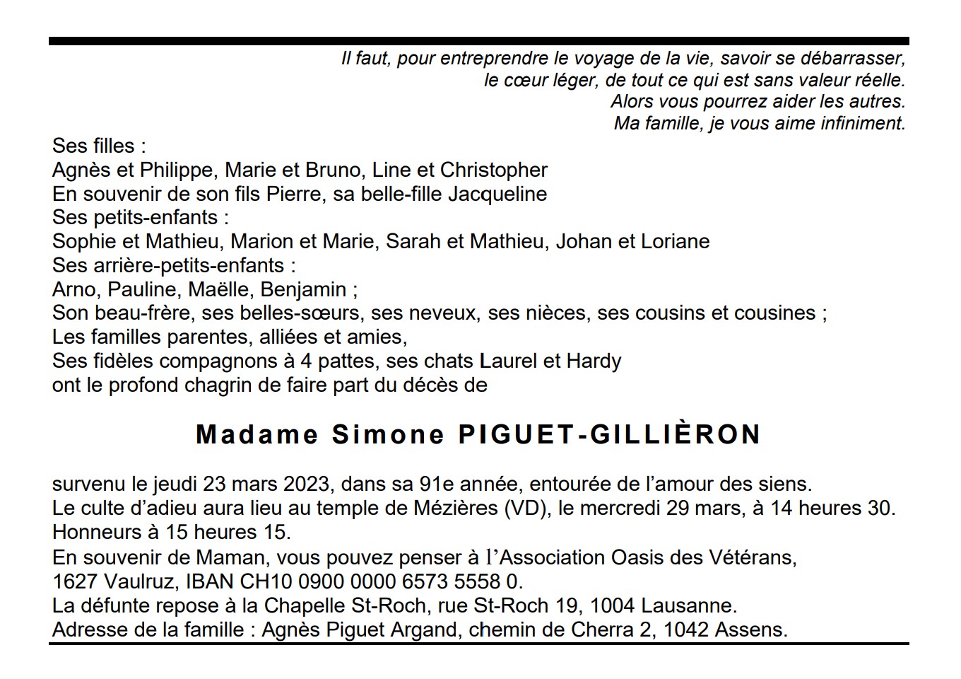 Madame Simone PIGUET-GILLIÈRON 21 déc. 1932 - 23 mar. 2023 Avis mortuaire PFG Télecharger PDF Partager sur: Galerie PreviousNext PreviousNext