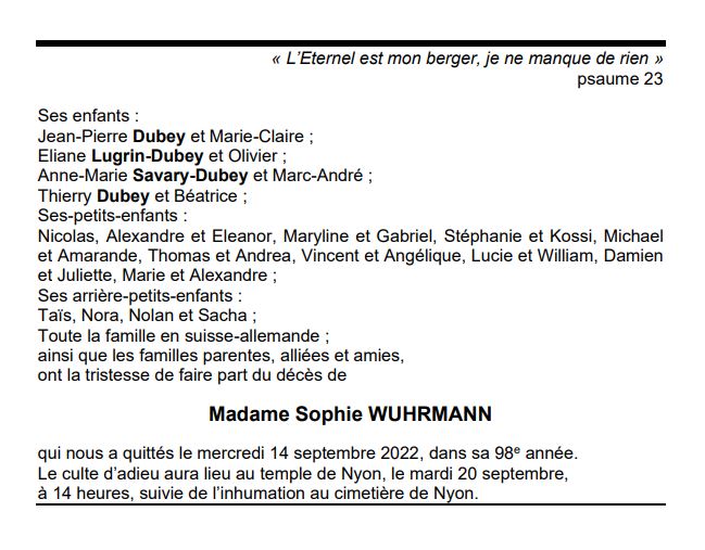 Madame Sophie WUHRMANN 20 déc. 1924 - 14 sep. 2022 Avis mortuaire PFG Télecharger PDF Partager sur: Galerie PreviousNext PreviousNext