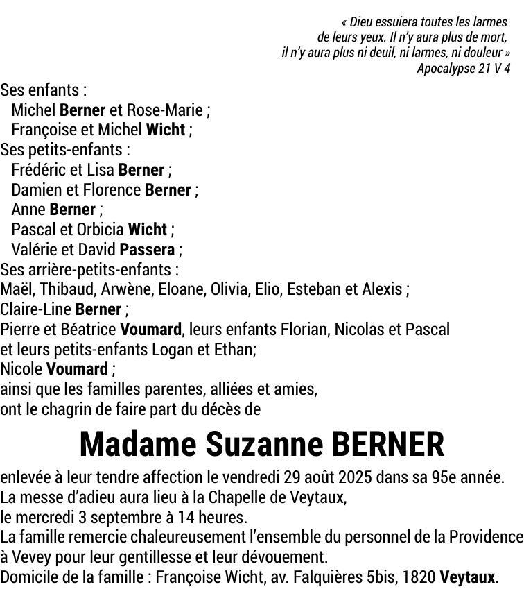 Madame Suzanne BERNER 17 déc. 1930 - 29 aoû. 2025 Avis mortuaire PFG Partager sur: Galerie PreviousNext PreviousNext