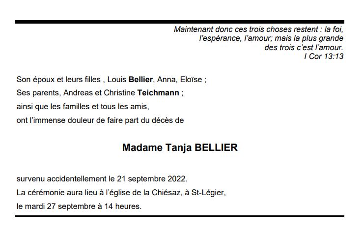 Madame Tanja BELLIER 21 sep. 2022 Avis mortuaire PFG Télecharger PDF Partager sur: Galerie PreviousNext PreviousNext