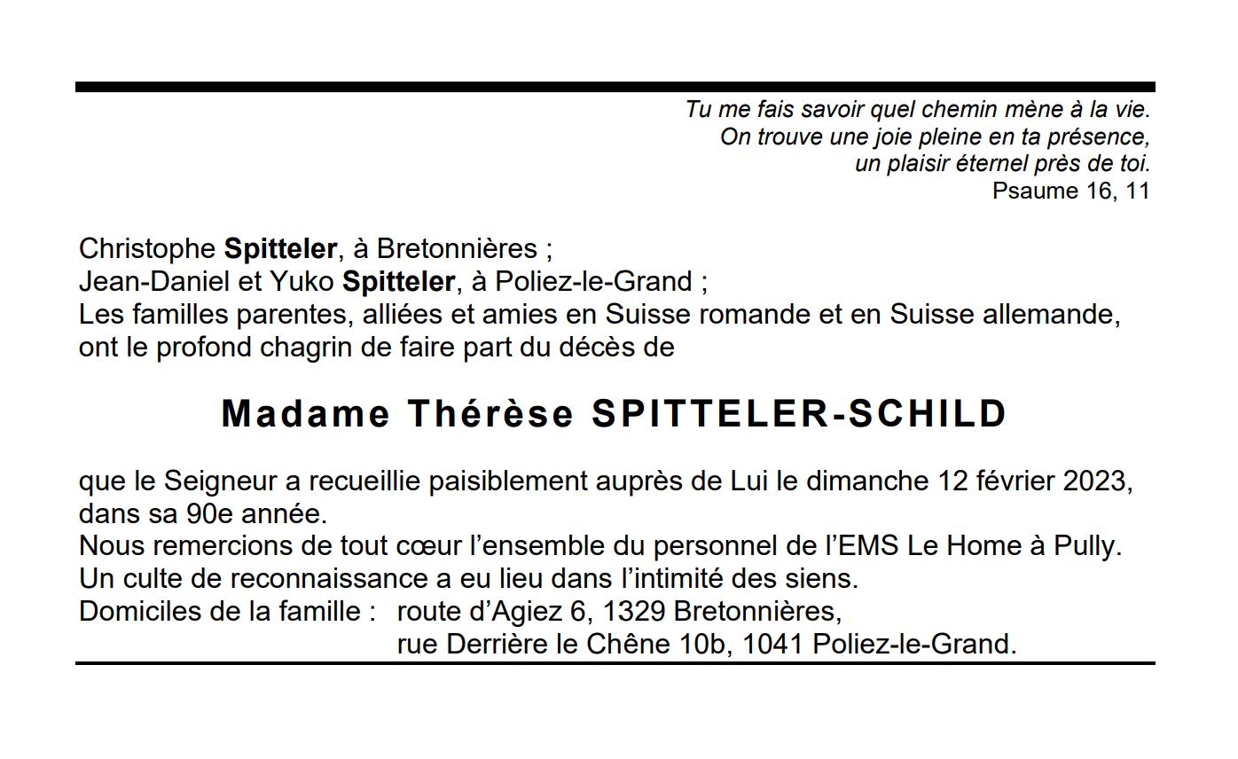 Madame Thérèse SPITTELER-SCHILD 27 avr. 1933 - 12 fév. 2023 Avis mortuaire PFG Télecharger PDF Partager sur: Galerie PreviousNext PreviousNext
