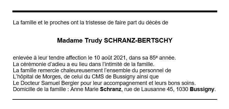 Madame Trudy SCHRANZ-BERTSCHY 30 déc. 1936 - 10 aoû. 2021 Avis mortuaire PFG Télecharger PDF Partager sur: Galerie PreviousNext PreviousNext