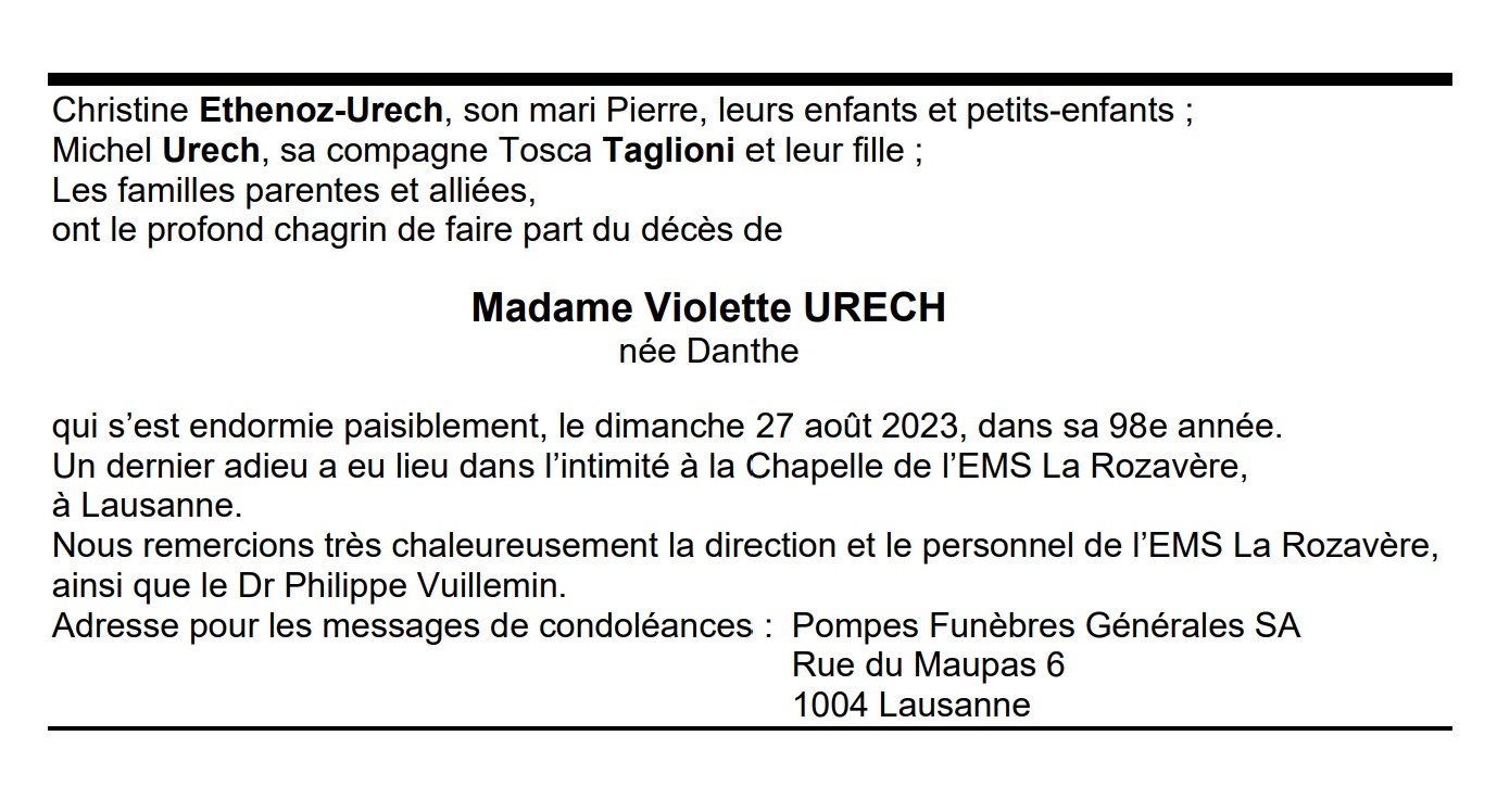 Madame Violette URECH née Danthe 16 juin. 1926 - 27 aoû. 2023 Avis mortuaire PFG Télecharger PDF Partager sur: Galerie