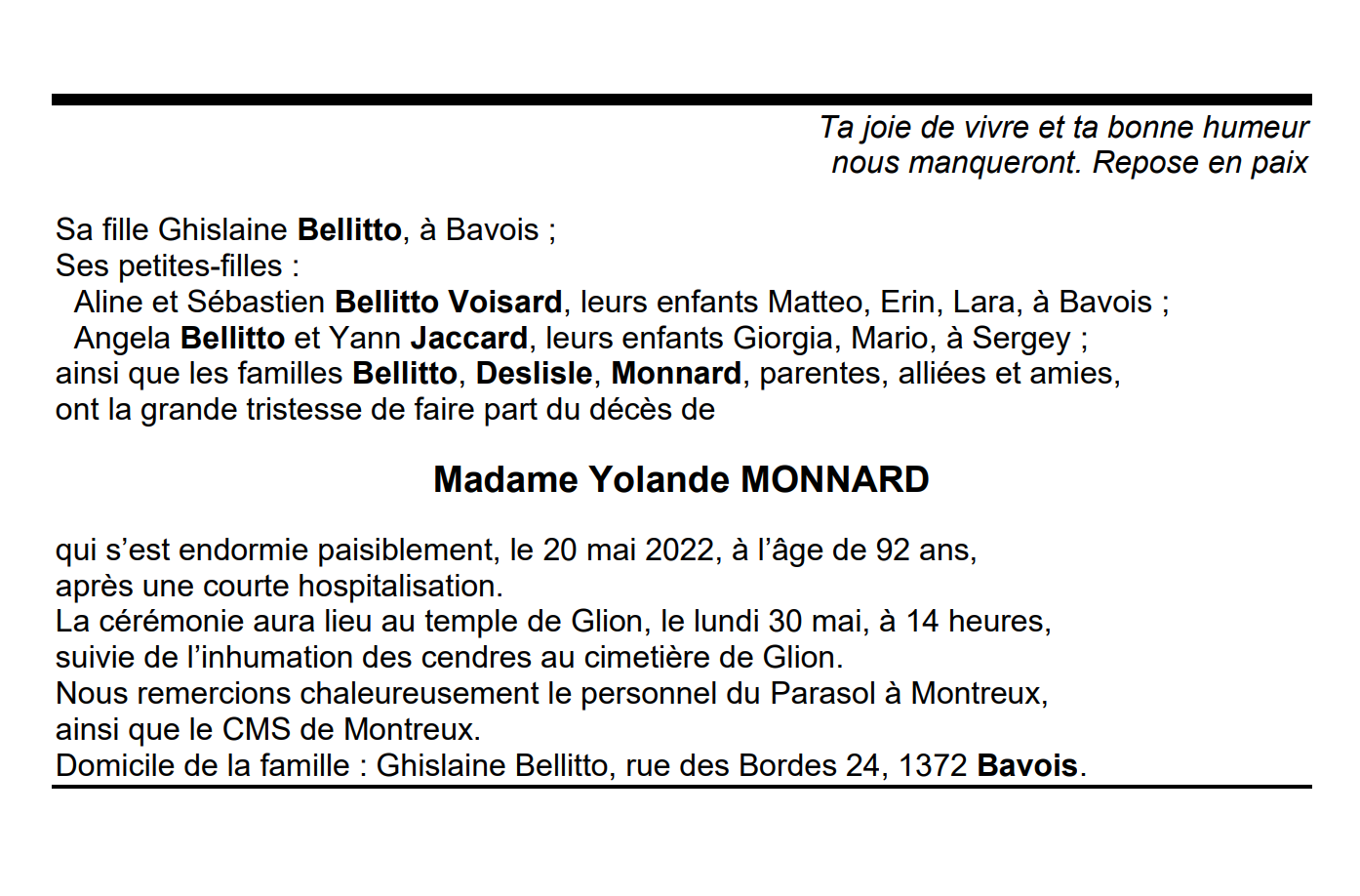 Madame Yolande MONNARD 05 avr. 1930 - 20 mai. 2022 Avis mortuaire PFG Télecharger PDF Partager sur: Galerie PreviousNext PreviousNext