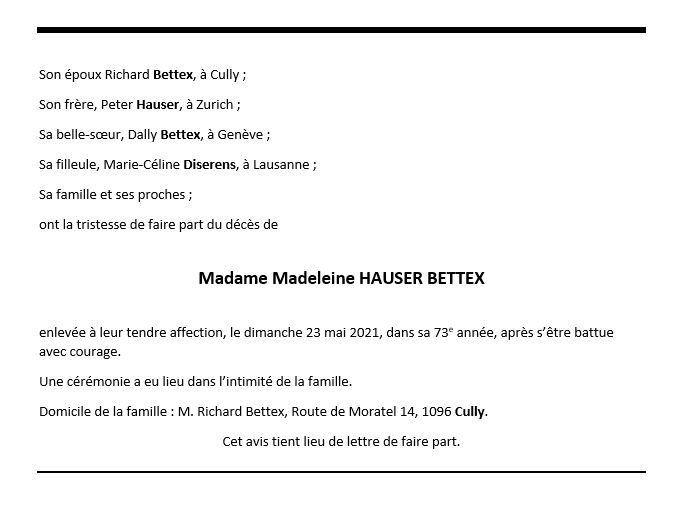 Madeleine HAUSER BETTEX 23 avr. 1949 - 23 mai. 2021 Avis mortuaire PFG Télecharger PDF Partager sur: Galerie PreviousNext PreviousNext