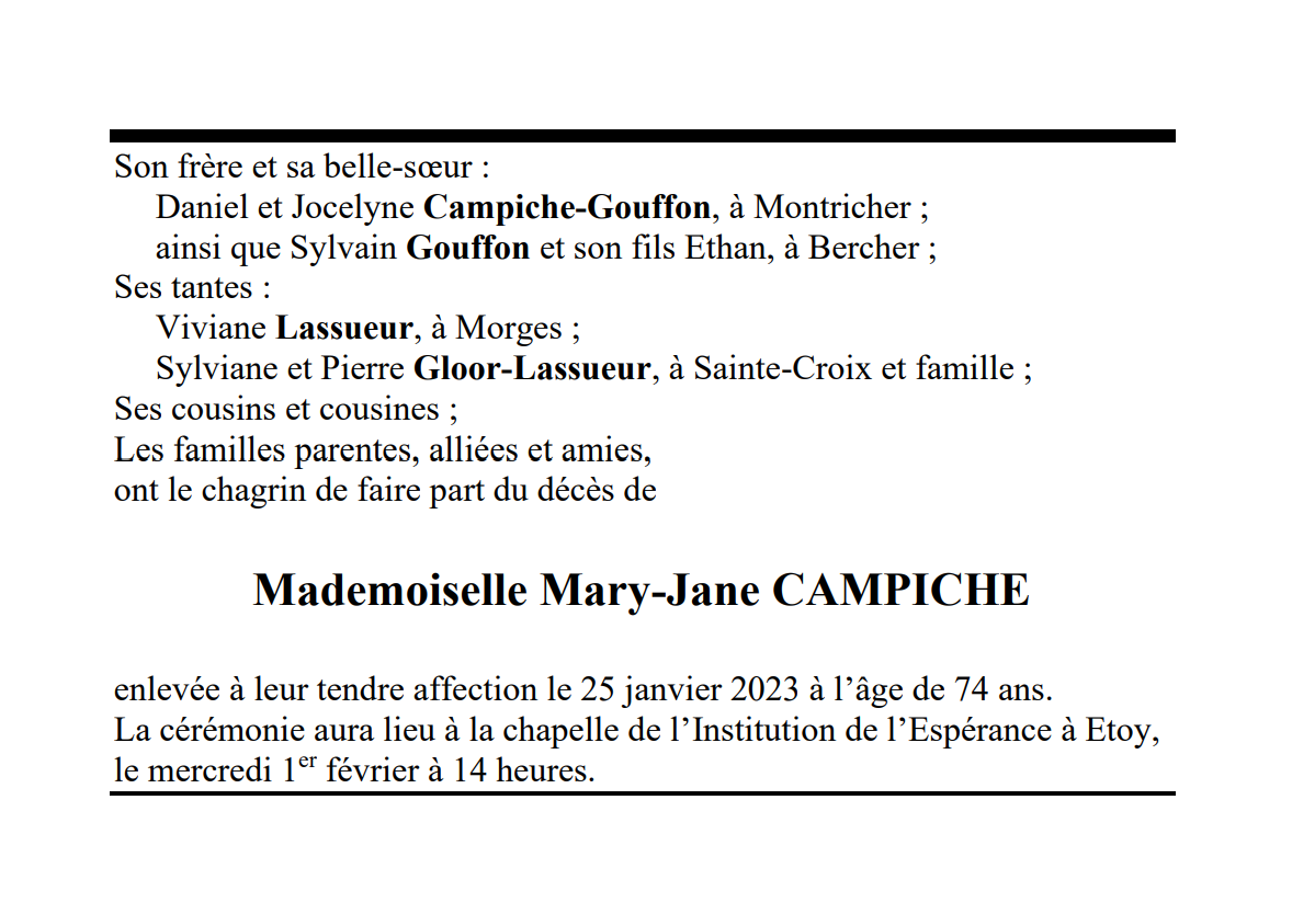 Mademoiselle Mary-Jane CAMPICHE 03 jan. 1949 - 25 jan. 2023 Avis mortuaire PFG Télecharger PDF Partager sur: Galerie